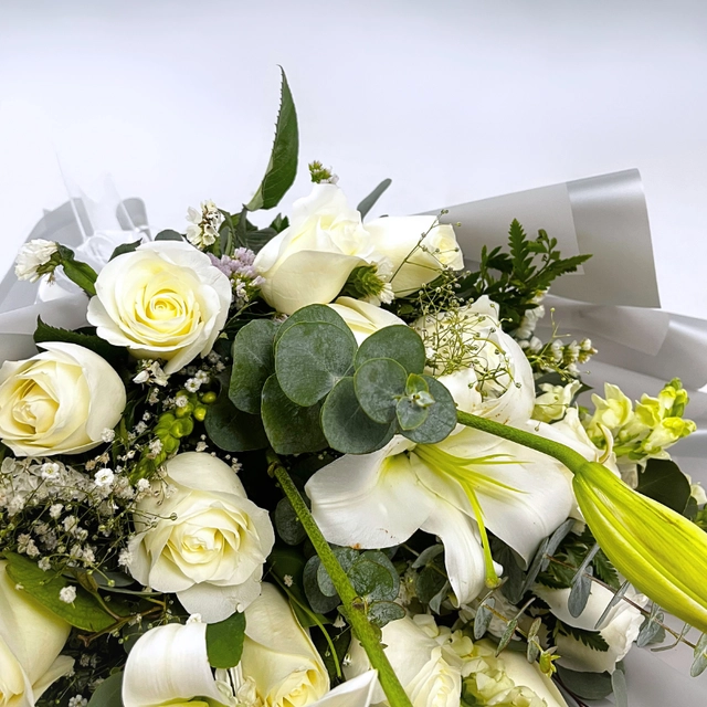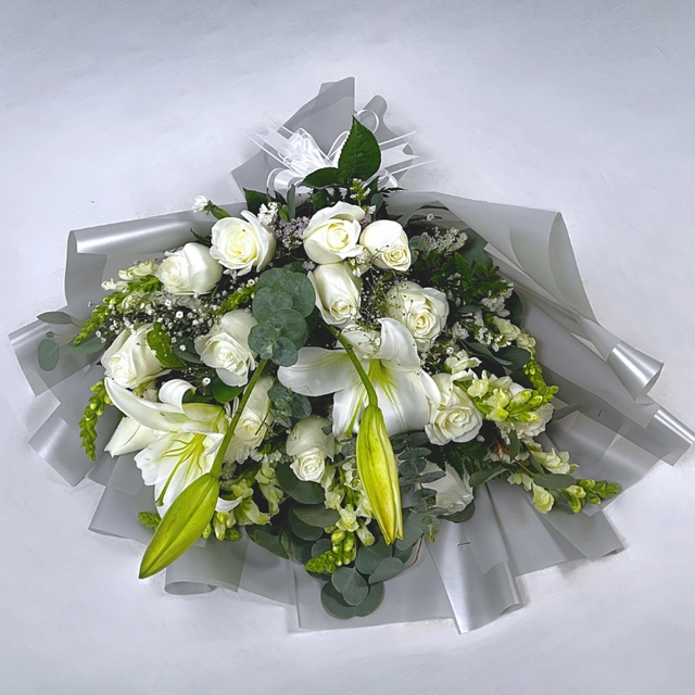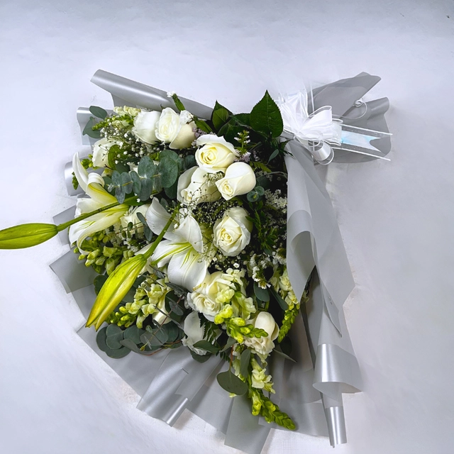 Un hermoso ramo de flores blancas envuelto en un papel translúcido de color plateado compuesto por Rosas blancas lirios blancos creando un efecto de densidad y volumen, dándole un toque delicado y romántico