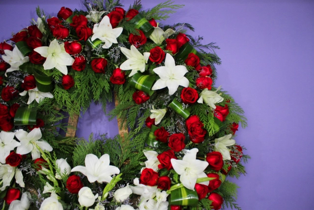 Una bonita corona funeraria lleno de rosas blancas, rosas color rojo y lilis.