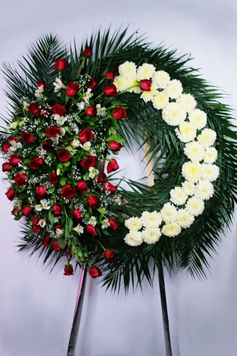 Bonita corona funeraria, con rosa roja, baby, alstroemeria.