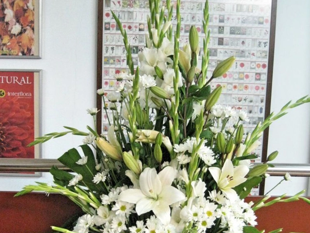 Hermoso lateral de una vista elaborado con casablanca, margarita blanca a elegir, 6 rosas blancas, gerbera blanca y cambray.