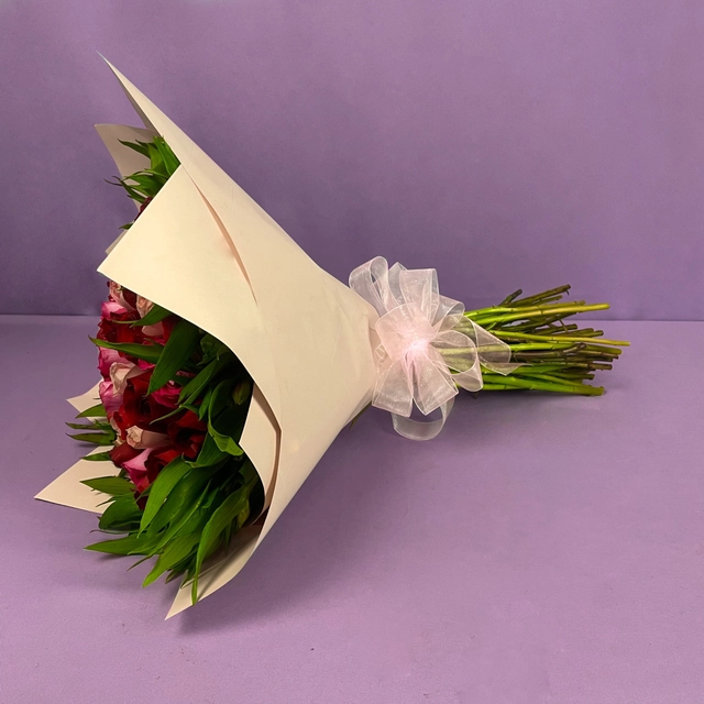 Bonito ramo con 45 rosas rojas, rosas lilas y astrometría, perfecto para regalos de cumpleaños, para la novia y más.
