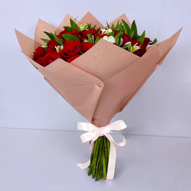 Ramo de 36 rosas rojas con alstroemeria y envoltura plastificada color rosa pastel.