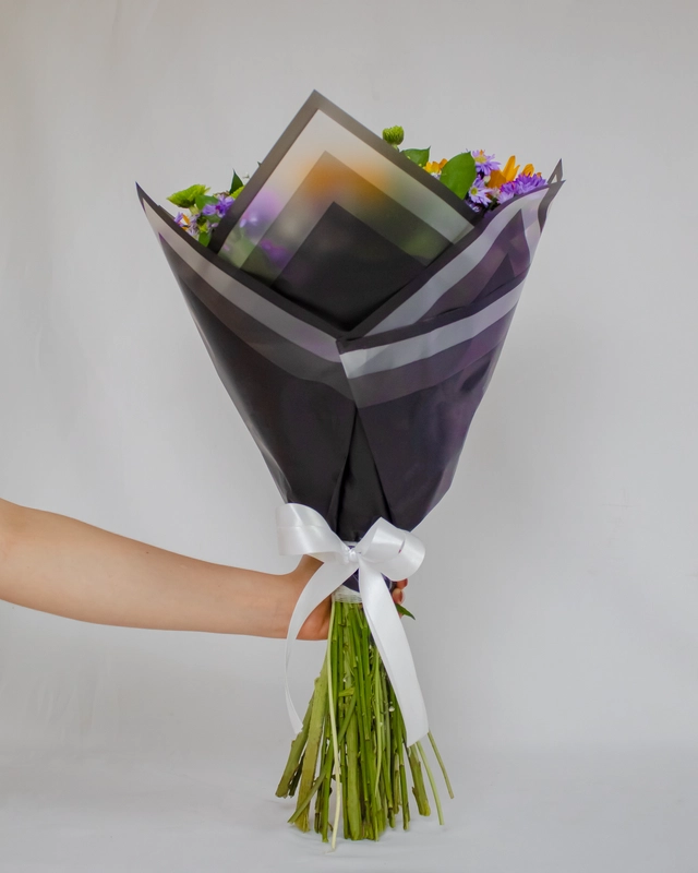 Hermoso ramo con 5 girasoles, yoko. montecasino morado y gypsophilia. Con la posibilidad de que el color del papel varíe según la existencia disponible