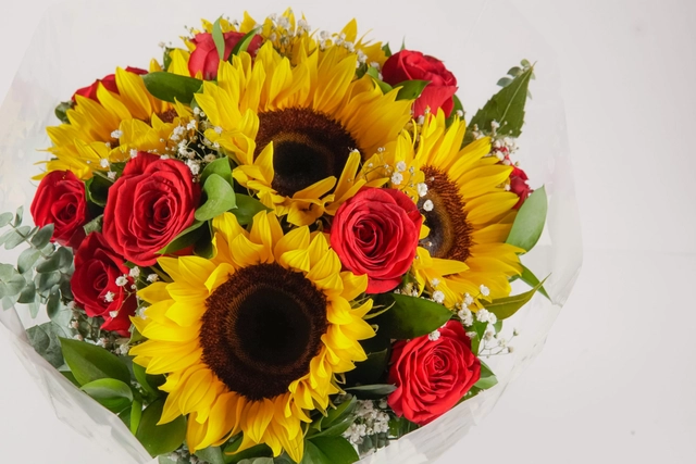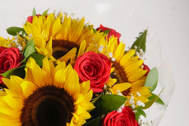 Ramo de girasoles con rosas rojas y girasoles. Algo simple sin perder elegancia.