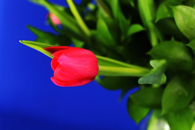 Elegante jarrón con 15 tulipanes: 5 rojos, 5 blancos y 5 amarillos.