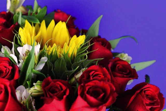 Jarrón con 24 Rosas rojas, alstroemeria y girasol.