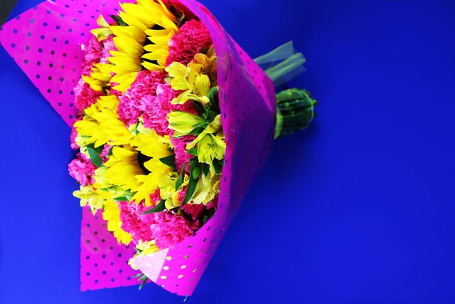 Bouquet de claveles rosas con girasol y alstroemeria.