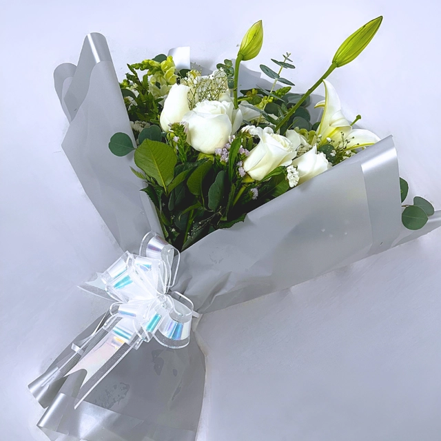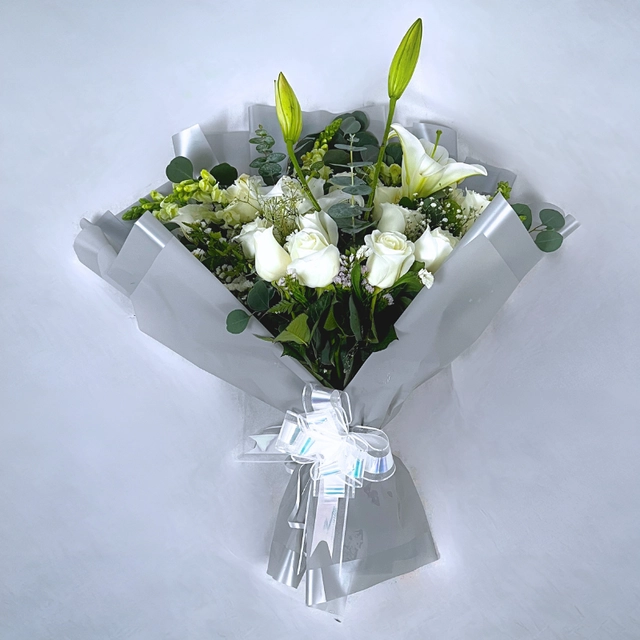 Un hermoso ramo de flores blancas envuelto en un papel translúcido de color plateado compuesto por Rosas blancas lirios blancos creando un efecto de densidad y volumen, dándole un toque delicado y romántico