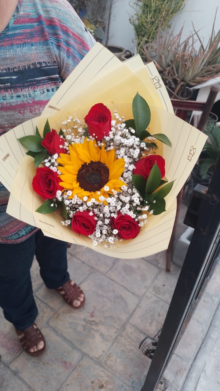 HERMOSO Y PEQUEÑO RAMO DE 6 ROSAS CON 1 GIRASOL EN EL CENTRO
