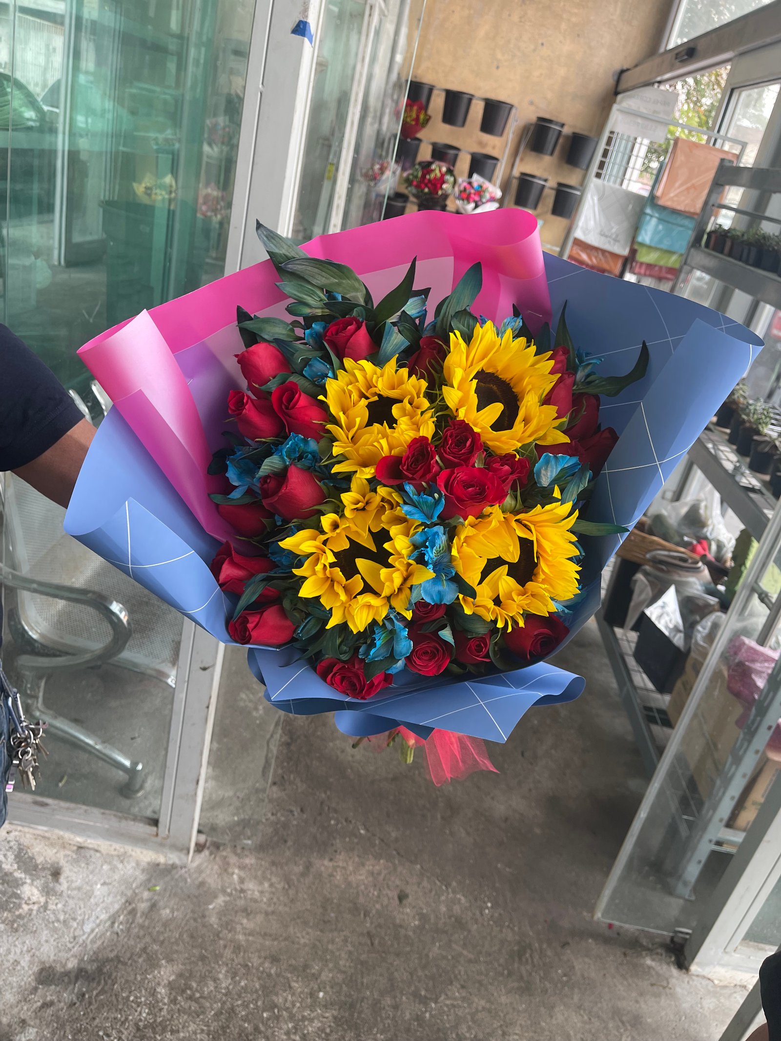 HERMOSO RAMO IDEAL PARA HOMBRE O MUJER CON UN TOQUE DE ASTROMELIA AZUL 4 GIRASOLES CENTRALES Y 24 ROSAS ROJAS