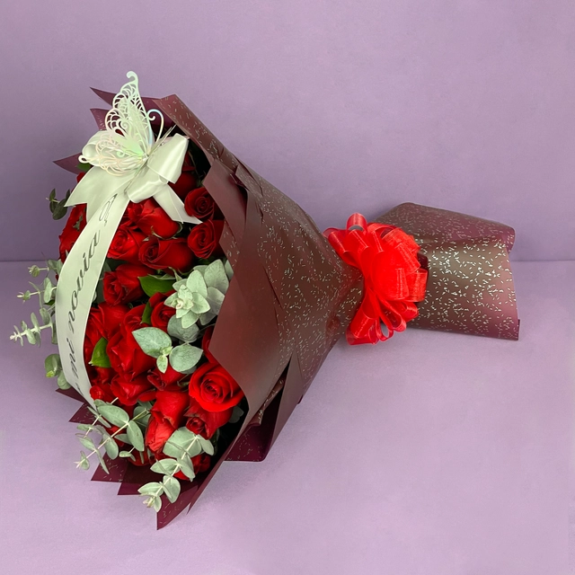 Ramo único : 50 rosas, follaje de dólar, banda "¿Quieres ser mi novia?" y una mariposa. Detalles de papel varían.