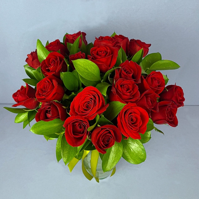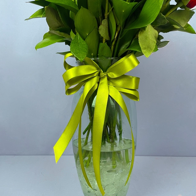 Un jarrón de 24 rosas rojas vibrantes con un listón verde oliva atado alrededor. La combinación de colores crea un contraste llamativo, aportando un toque moderno y elegante a la composición floral.