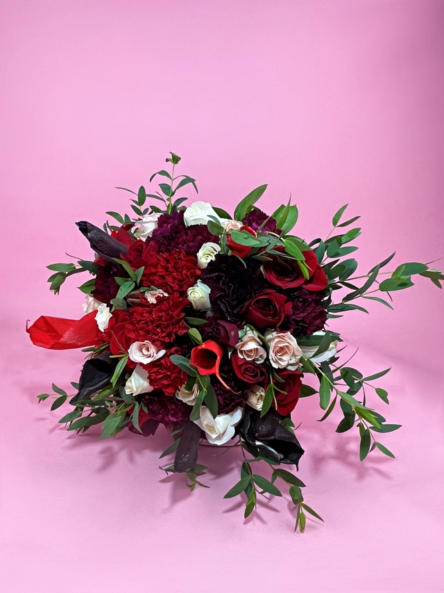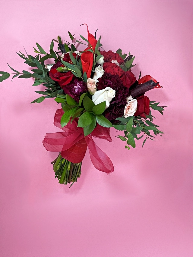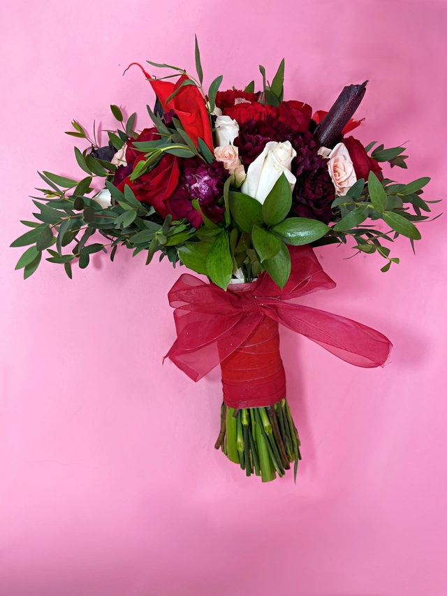 Ramo de novia elaborado con 6 rosas rojas, clavel rojo y clavel sangre de toro, mini rosa rosa, parbifolia, ruscus y alcatraz pintado.