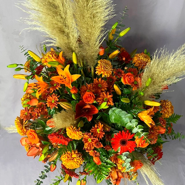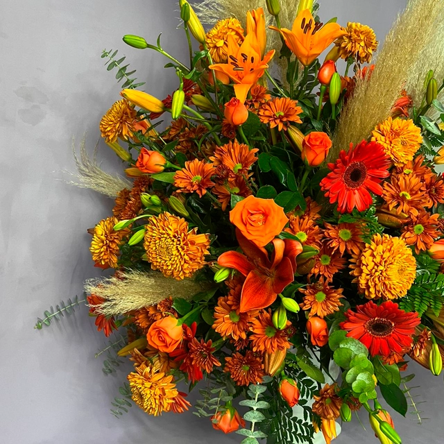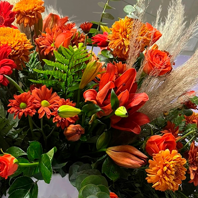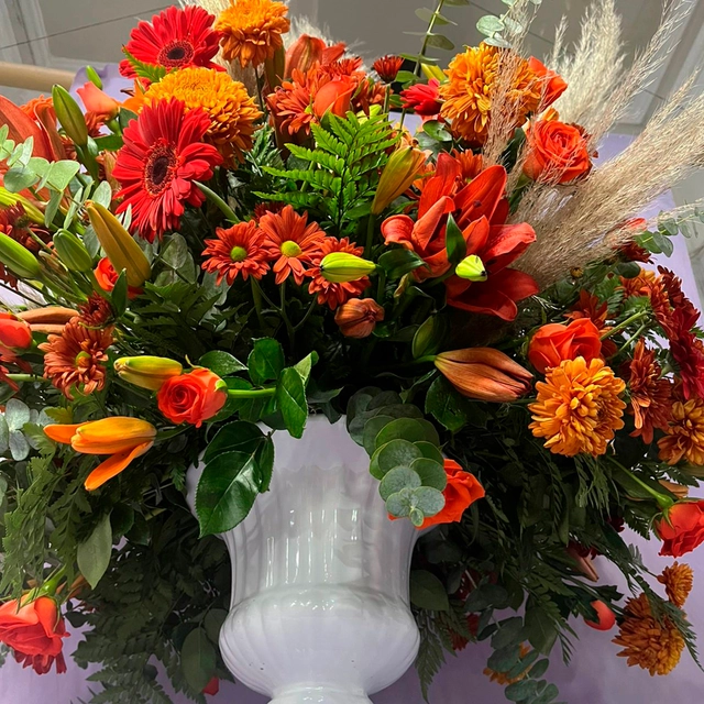 La combinación de colores amarillo, naranja y verde, crea un ambiente cálido y lujoso. Nuestro arreglo es ideal para bodas, aniversarios, festejos, galas y cualquier otro evento que merezca un toque de distinción.