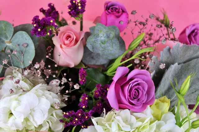 Base cerámica en color rosa con lisianthus, dólar, rosas, baby, hortensias y follaje. Ideal para el aniversario de una persona.