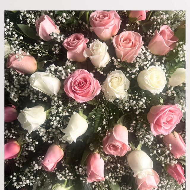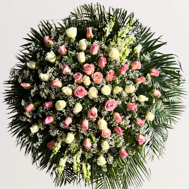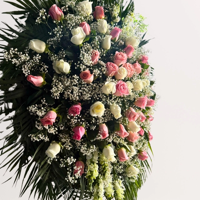 Corona floral con rosas blancas, rosas caricia y perritos, ideal para expresar cariño y acompañar en momentos de despedida.