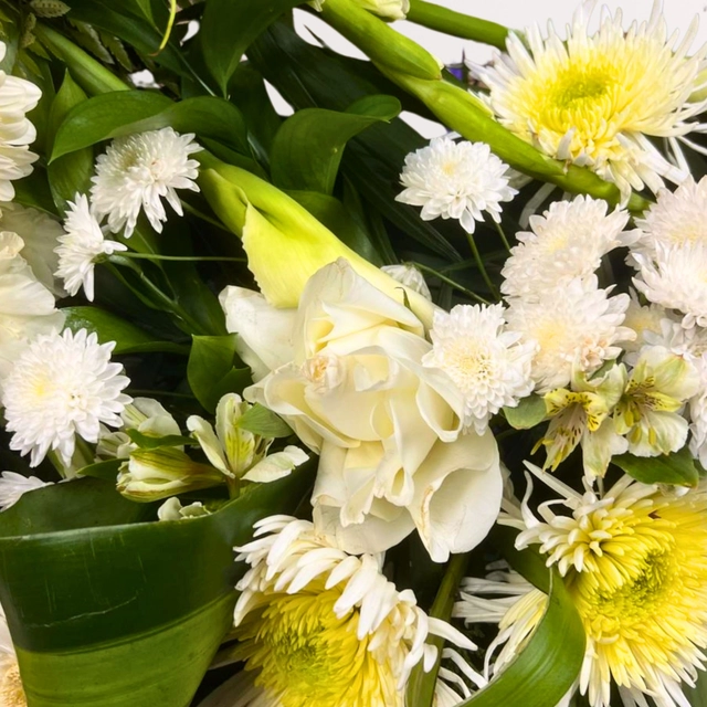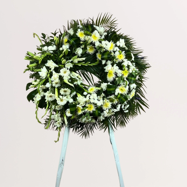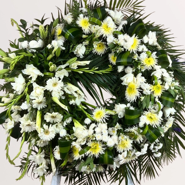 Corona funeraria de 1 m elaborada con Cambray, Gladiolas, Rosas blanca, Alcatraz, Gerbera, Spider y Lilys.