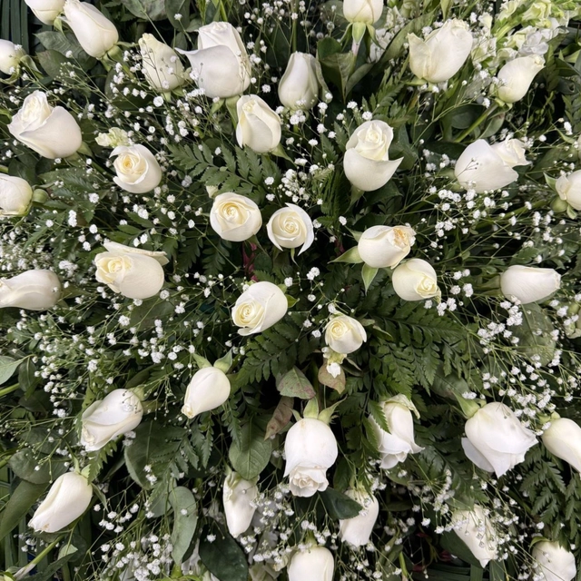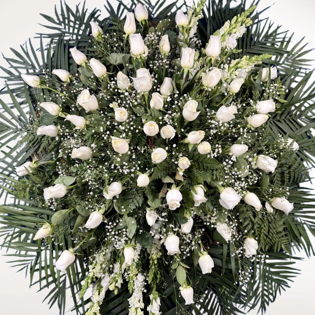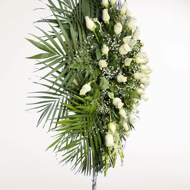 Corona floral con rosas blancas y perritos, ideal para expresar cariño y acompañar en momentos de despedida.