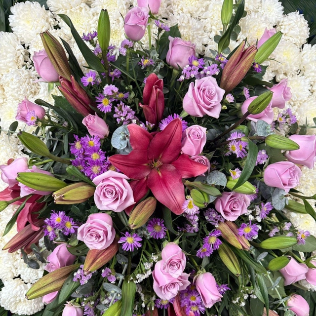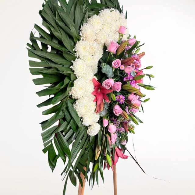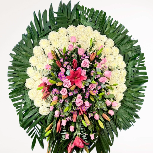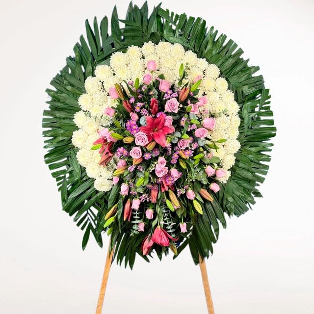 Corona Fúnebre elaborada con rosas nauticas, montecasino morado, dollar, lilys y polar.