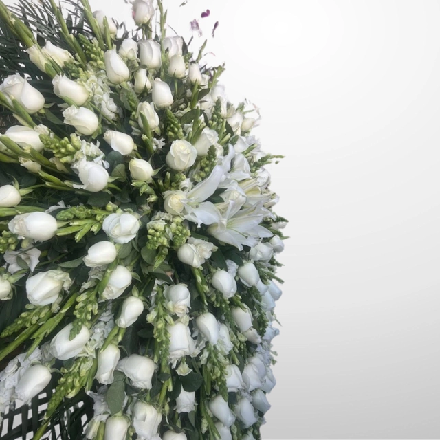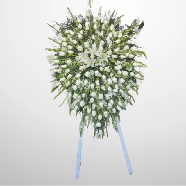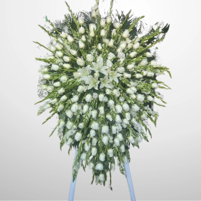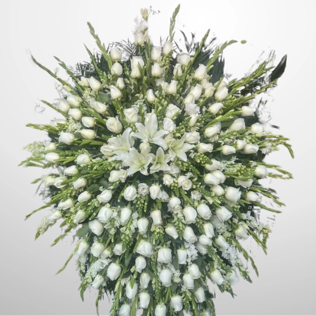 Corona funeraria de 1 m elaborada con Cambray, Gladiolas, Rosas blanca, Perritos, Casa blanca y Leather.