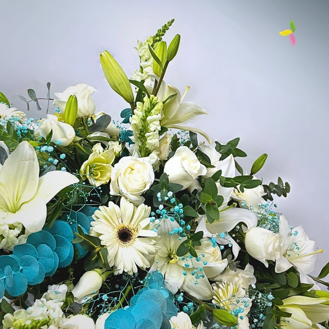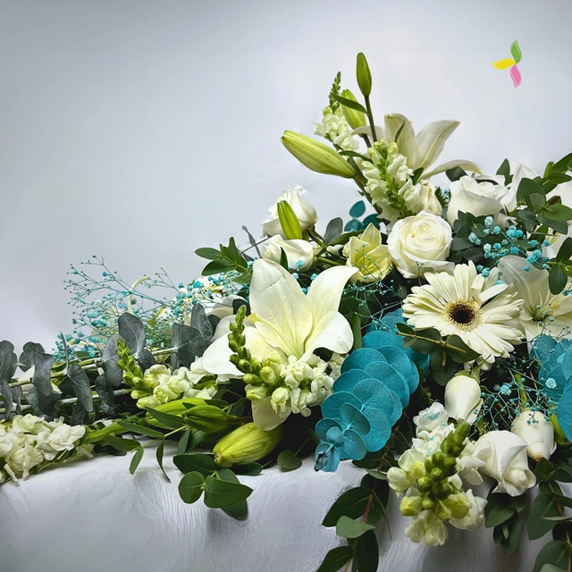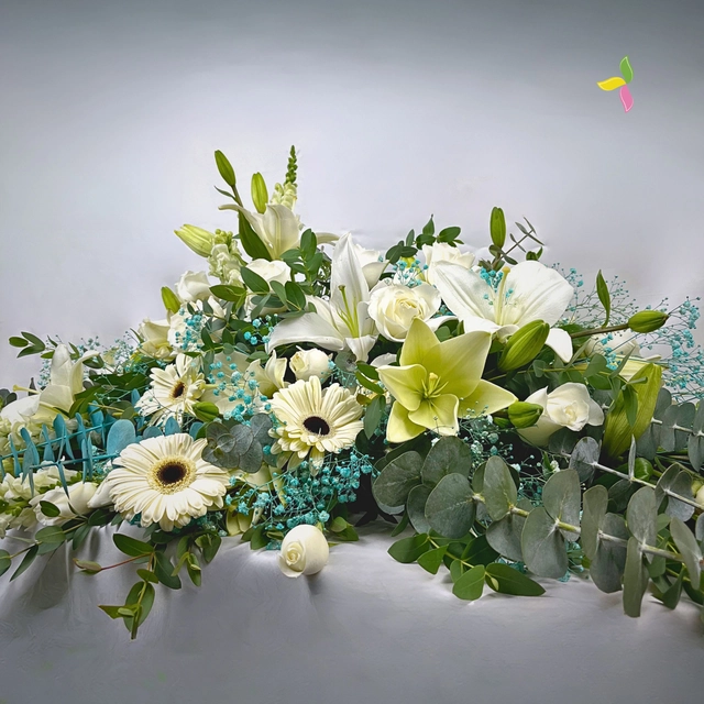 Con elegancia y respeto, nuestro Cubrecaja Esperanza, ofrece un espacio sagrado para rendir homenaje a tus seres queridos. Diseñado con flor de alta calidad y atención al detalle, proporciona un entorno sereno y digno para despedir a aquellos que han partido. Su diseño clásico y sobrio de flor blanca y follaje verde, se adapta a cualquier ceremonia, permitiendo que la atención se centre en los recuerdos y el legado de quien se ha ido. Un gesto de amor y respeto en momentos de duelo.