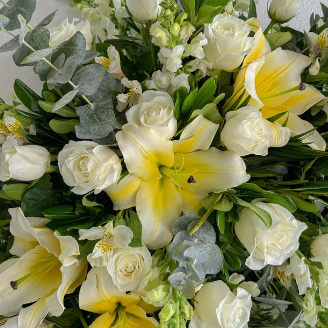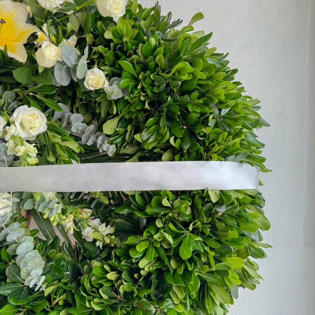 Hermosa Coroa con stargazer y rosa todo en tonalidades color blanco , rodeada de un hermoso follaje verde. Para comprartir el sentimiento de Calma y amor en los momentos más difíciles