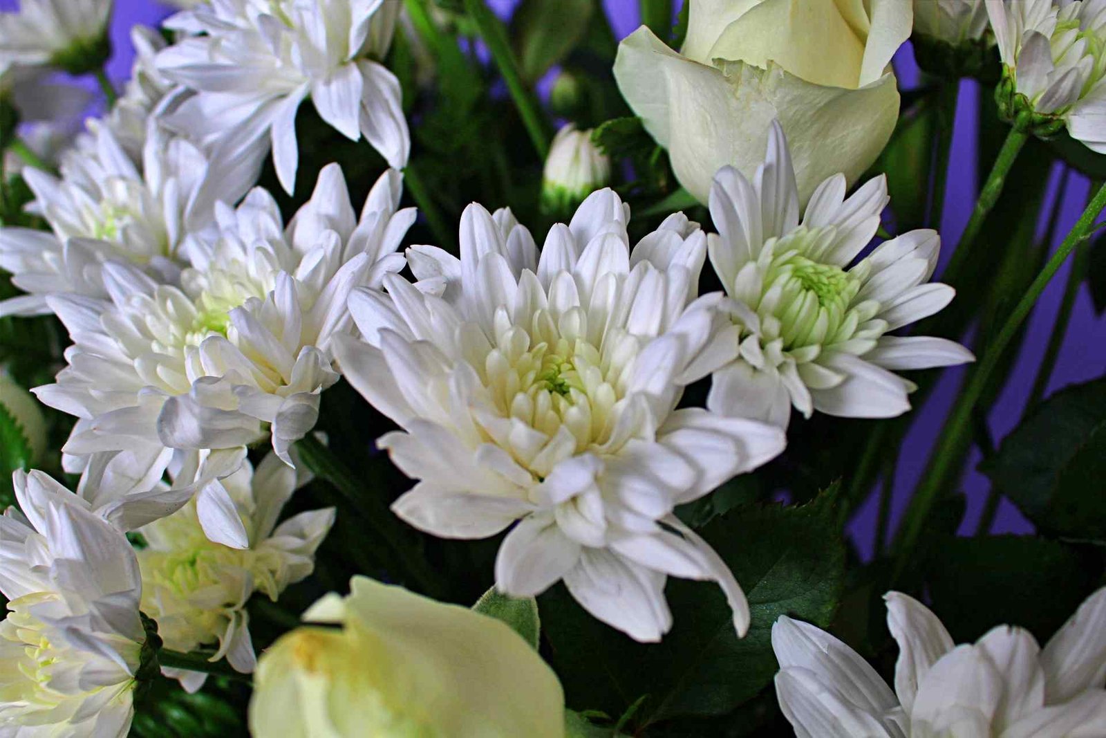 Arreglo elaborado con flores blancas, contiene rosas blanca, gladiolas y velos de la mejor calidad.