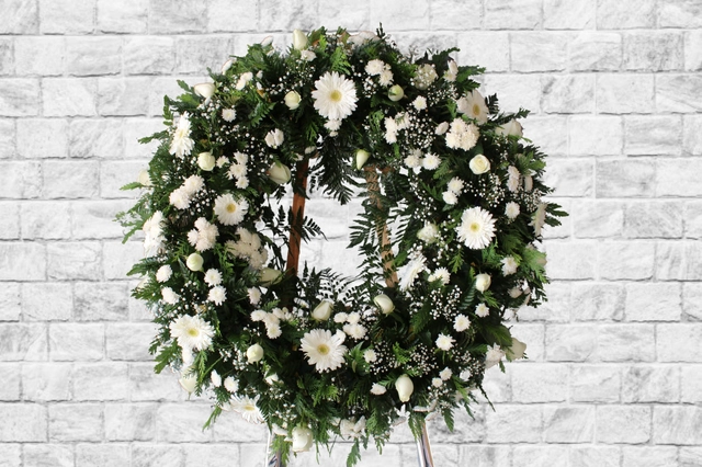 Corona funeraria elaborada principalmente por flores blancas. En su composición podemos encontrar gerberas y rosas blancas con retoques de gypsophila.